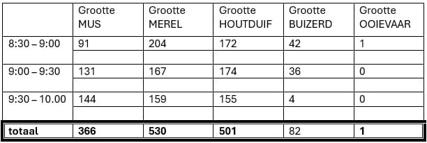In onderstaande tabel zijn de totalen van de door de vier telgroepjes waargenomen overtrekkende vogels per halfuur weergegeven. Hierbij zijn dubbeltellingen zoveel als mogelijk uitgefilterd.