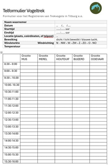 Omdat de meeste tellers niet ervaren waren werden de vogels geteld op basis van de grootte van de vogels. We onderscheiden 5 categorieën van mus tot ooievaar. Hiervoor werd gebruik gemaakt van in te vullen telformulieren zoals onderstaand voorbeeld.